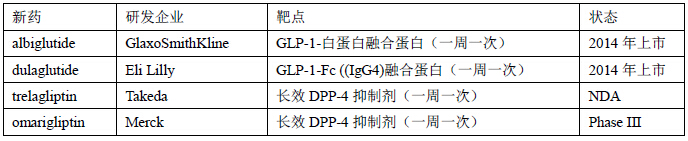 国外一周一次的长效DPP-4抑制剂和GLP-1类似物已经上市或处于后期开发,国内暂时未见长效DPP-4抑制剂的报道,无锡和邦、江苏泰康、浙江华阳、河北常山等都申报了长效GLP-1类似物。