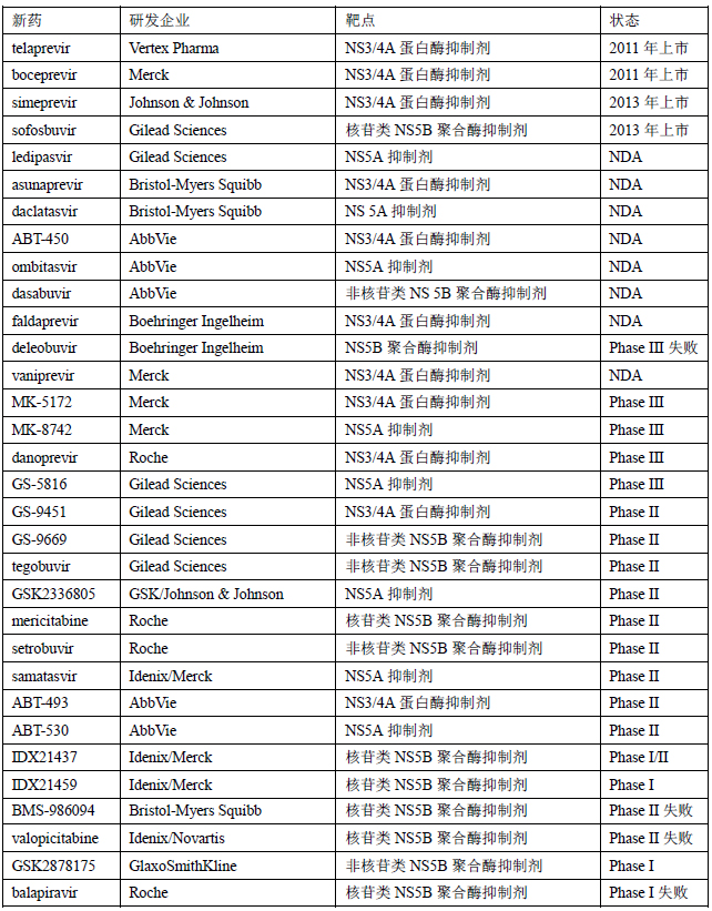 国内自主研发的抗丙肝药物主要是NS3/4A蛋白酶抑制剂,包括苏州银杏树的赛拉瑞韦、杭州歌礼从Roche引进的danoprevir(ASC08)、正大天晴从BioLineRx引进的BL-8030,另外广东东阳光申报了NS5A抑制剂依米他韦,但目前仍然没有NS5B聚合酶抑制剂和组合抗丙肝疗法。