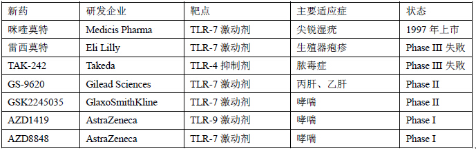 Toll-like receptor是巨噬细胞、树突细胞表达的一种膜受体,有TLR1至TLR13等多个亚型,能够识别微生物上的保守性分子,启动先天性免疫反应。Gilead开发GS-9620用于治疗HBV、HCV感染,而AstraZeneca、GlaxoSmithKline则开发TLR激动剂用于哮喘。