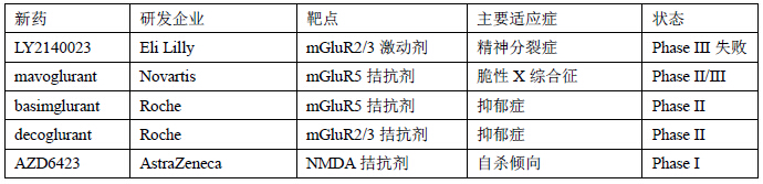 目前已经上市多个AMPA受体激动剂(奥拉西坦、吡拉西坦、阿尼西坦)、AMPA受体拮抗剂(吡仑帕奈)、NMDA 受体拮抗剂(氯胺酮、苯环利定),现在的研究热点是代谢型受体调节剂。