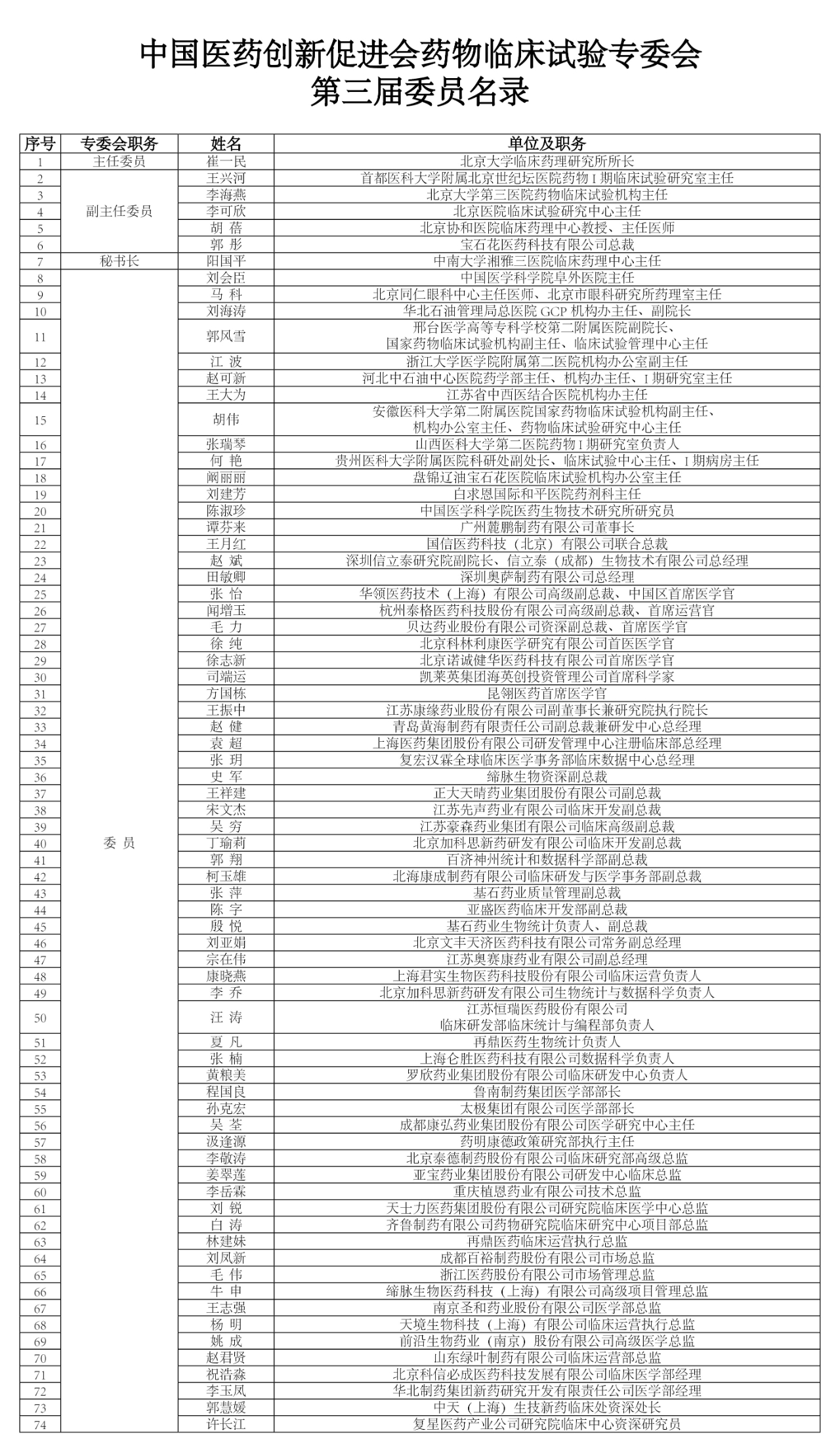 根据《中国医药创新促进会专业委员会管理办法》相关规定,会议审议通过临床专委会第三届委员,共74人(名单附后)。推选北京大学临床药理研究所所长崔一民担任临床专委会第三届主任委员;首都医科大学附属北京世纪坛医院药物I期临床试验研究室主任王兴河、北京大学第三医院药物临床试验机构主任李海燕、北京医院临床试验研究中心主任李可欣、北京协和医院创新药物临床药代药效研究北京市重点实验室主任胡蓓、宝石花医药科技有限公司总裁郭彤为第三届副主任委员;中南大学湘雅三医院临床试验研究中心主任阳国平为第三届秘书长。