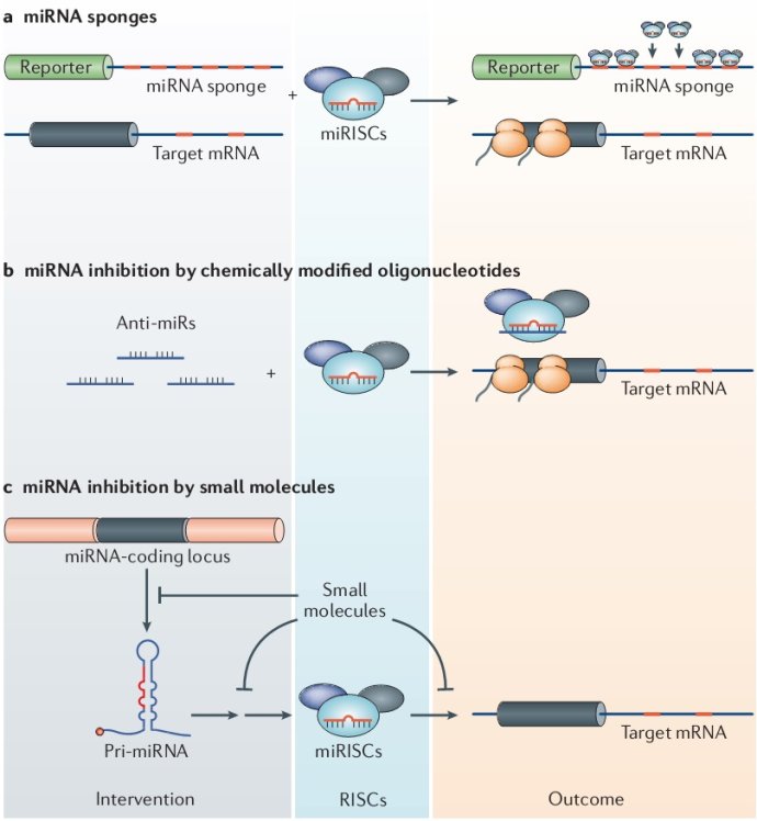 miRNA涉及多个生物化学步骤,可以筛选小分子抑制剂,干扰miRNA的表达和功能的实现。比如有文献[1,2]报道了抑制miR-21和miR-122的小分子,但EC50在微摩尔级,而且缺乏直接靶点的信息,因此应用潜力仍然非常有限。