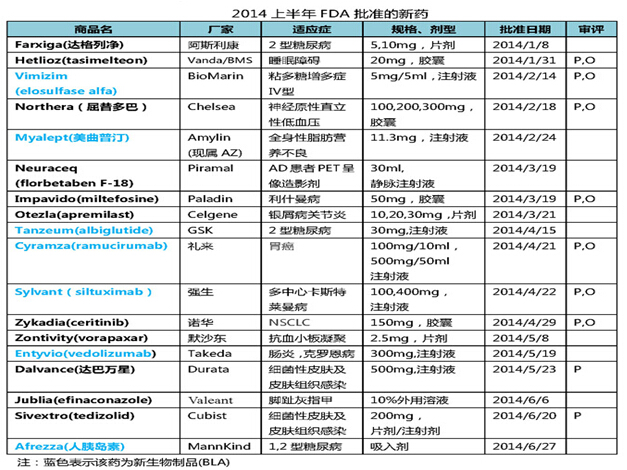 2014上半年FDA批准的18个新药里面,9个药物以优先审评的方式获批,其中7个药物拥有孤儿药资格,反映出FDA在满足罕见病患者用药需求方面的努力成果。特别值得一提的是,FDA在2014上半年批准了7个新生物制品(new BLA),如果以2013年全年FDA批准的2个BLA(罗氏的Kadcyla和Gazyva)做一对比,2014年的BLA可以说是呈井喷态势。2013年全球销售额top10的药品当中有7个属于生物制品,生物类似物的开发浪潮也是一浪高过一浪,在这种背景下,生物制品的开发俨然就是制药企业的未来。