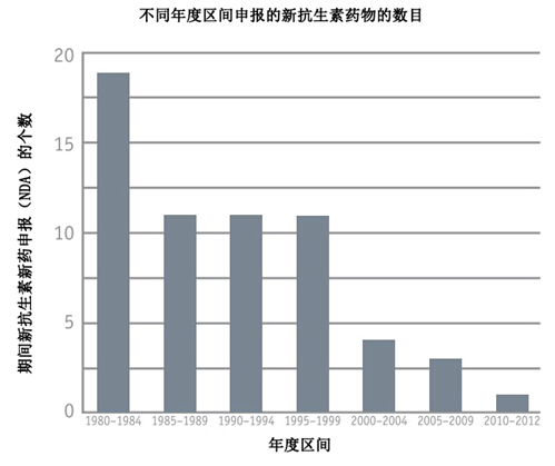 抗菌素是临床上使用最频繁的基本药物之一。由于历史原因造成的抗生素不规范使用,造成细菌对现有抗生素严重的抗药性。多药耐药(MDR)的细菌感染已经成为全球公共健康的主要威胁之一。正因为多药耐药,抗菌素的联合用药也日趋增多,药物-药物相互作用也增加了不良反应的发生风险。根据最近国家食药监总局发布的2013年国家药品不良反应监测年度报告,由抗菌素引起的不良反应高居不良反应/事件报告的首位。对目前绝大多数可用的抗生素都有抗药性的“超级细菌”也以惊人的速度在世界范围蔓延。另一方面,新型有效的抗生素研发并没有伴随MDR细菌的增加而增加。根据美国FDA新药评价中心(CDER)的数据,自1980年以来新批准的抗生素数量反而在不断减少(见下图)。现有的抗菌素已经无法治愈日益增加的感染和耐药。