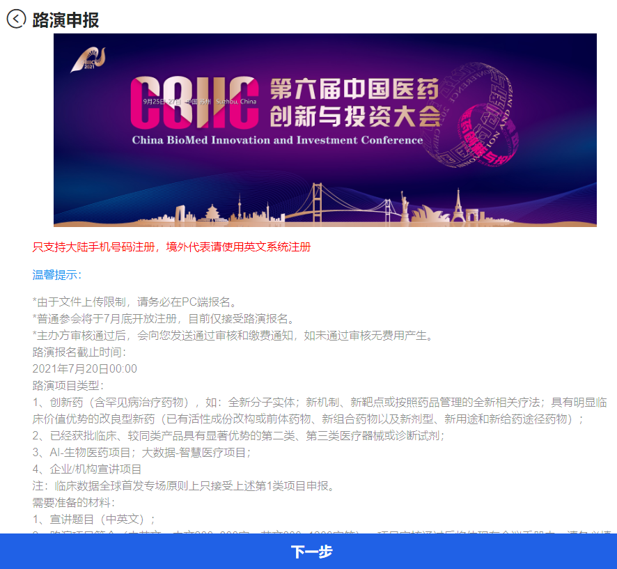 如需进行项目路演或者临床数据全球首发申报,请选择【路演报名】。