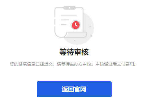 至此,路演项目申报已经完成,您注册的手机和邮箱将收到审核通知;请耐心等待审核结果,审核结果将以邮件或者短信形式发送,您可登录进入个人中心随时查看审核进度并处理审核意见。