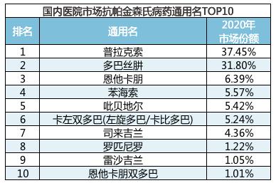 而在米内网国内医院市场抗帕金森氏病通用名Top10中,国内品种仍是普拉克索、多巴丝肼占据绝对的市场份额,分别为37.45%和31.8%;其次锐减至恩他卡朋、苯海索、吡贝地尔、卡左双多巴(左旋多巴/卡比多巴)和司来吉兰,分别为6.39%,5.57%、5.42%、5.24%和4.36%;雷沙吉兰仅有1.05%的市场份额。