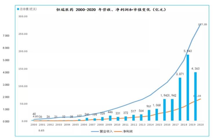 如下图20年时间,恒瑞医药营收从4.85亿元到2020年277亿元,净利润从0.65亿元到去年63亿元,市值从40亿到目前4300多亿,增长100多倍。
