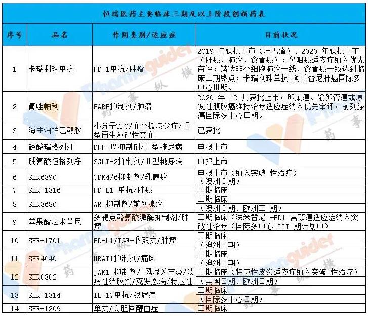 2020年报披露,注射用卡瑞利珠单抗与苹果酸法米替尼胶囊联合治疗复发转移性宫颈癌被纳入突破性治疗名单;注射用卡瑞利珠单抗局部复发或转移性鼻咽癌适应症及他氟前列素滴眼液等申请上市并获优先审评资格;注射用卡瑞利珠单抗肺癌领域研究成果登上《柳叶刀》,中位总生存期长达 27.9 个月,创全球同类最佳。