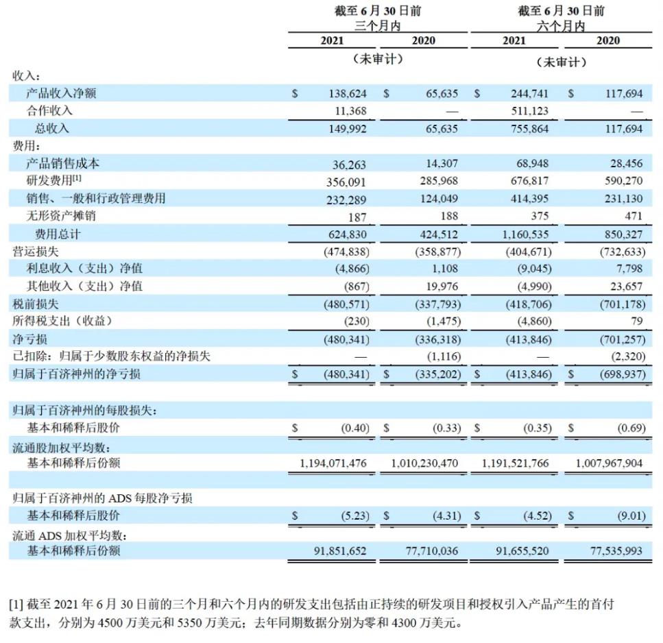 近日,百济神州发布2021年第二季度及上半年财务业绩,并披露了近期业务亮点和预计里程碑事件。2021年第二季度,百济神州总营收1.5亿美元,其中产品收入共计1.386亿美元,相较去年同期的0.656亿美元增长了111%。百泽安中国销售额7490万美元(去年同期2940万美元),百悦泽销售额4240万美元(去年同期700万美元),今年5月刚上市销售的百汇泽销售额已达220万美元。报告期内总支出6.248亿美元,研发支出为3.561亿美元(去年同期2.86亿美元)。
