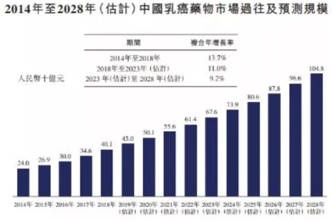 普克鲁胺第二个适应症乳腺癌,这是女性人口中最多发的癌症之一。根据弗若斯特沙利文预测,中国AR+的转移性乳腺癌患者总数从2014年的61.19万人以22%的复合年增长率增加至2018年135.6万人。预期这一趋势将会持续,中国AR+乳癌患者人数预计将从2018年按11.6%的复合年增长率增长至2023年的234.84万人,并从2023年按7.7%的复合年增长率增长至2028年的340.63万人。