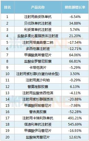 从销售额增长率看,信达的信迪利单抗、恒瑞的卡瑞利珠单抗涨幅惊人,分别为545.69%、491.21%。阿斯利康的奥希替尼、正大天晴的安罗替尼表现亦不俗,增长均超过60%。贝伐珠单抗在齐鲁制药的生物类似药的“助攻”下,也取得接近35%的涨幅。