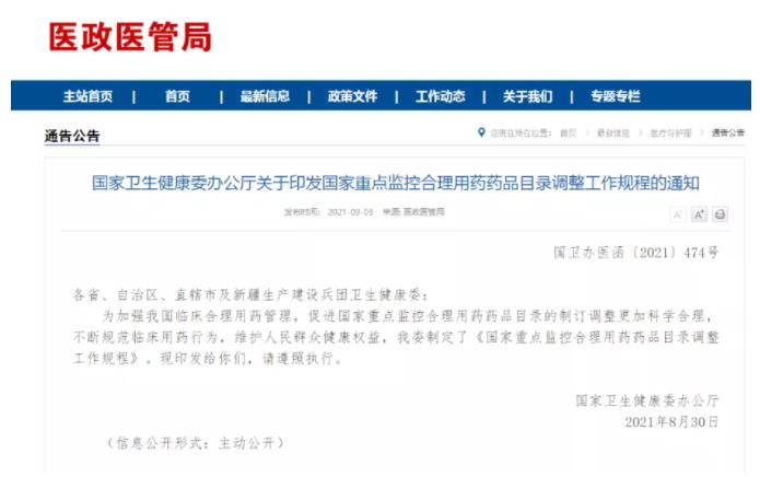 近日,国家卫健委发布了《国家重点监控合理用药药品目录调整工作规程》(下文简称《规程》),《规程》明确了重点监控合理用药药品的遴选范围、目录调整的4个阶段,确定了重点监控合理用药药品目录的调整原则、周期和工作程序等。