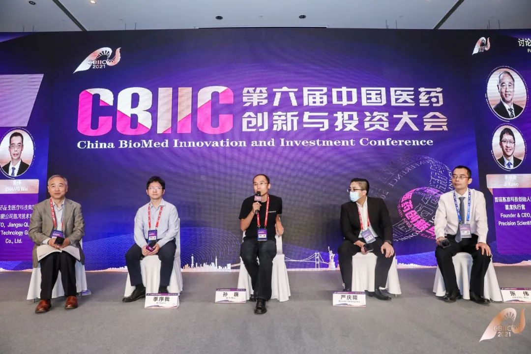 讨论嘉宾:普瑞基准科技创始人兼首席执行官季序我(左二)、无疆脑智科技创始人兼董事长孙巍(中间)、海纳亚洲基金合伙人严庆隆(右二)、江苏品生医疗科技集团有限公司首席技术官张伟(右一)