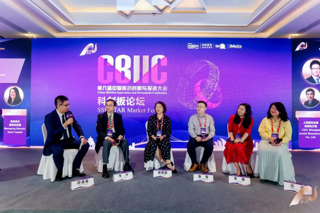 讨论嘉宾:君实生物首席执行官李宁(左二)、启明创投投资合伙人唐艳旻(左三)、中信证券投行委执行总经理张军(右三)、汉坤律师事务所生物医药部部长李英(右二)、泉创资本董事总经理巫荟(右一)