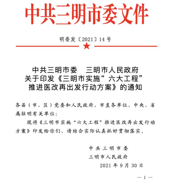 为深入贯彻落实习近平总书记今年3月来闽、来明考察重要讲话重要指示精神,按照孙春兰副总理来明调研的指示要求,以及省委、省政府和国家卫健委、国家医保局关于进一步深化医改的工作部署,坚持人民至上、敢为人先,以实施“六大工程”为抓手,推动三明医改再出发,继续在全国走前头作示范,为人民健康提供可靠保障,制定如下行动方案。