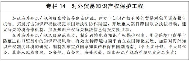 完善维护国家安全的知识产权政策。研究制定事关国家安全的关键核心技术知识产权保护规则。依法管理涉及国家安全的知识产权对外转让行为,完善知识产权对外转让审查制度。完善知识产权反垄断、公平竞争相关法律法规和政策措施。推进我国知识产权有关法律规定域外适用。研究建立针对进口贸易的知识产权境内保护制度。完善跨境电商知识产权保护规则。(中央宣传部、中央网信办、国家发展改革委、科技部、工业和信息化部、商务部、市场监管总局、国家国防科工局、国家知识产权局等按职责分工负责)