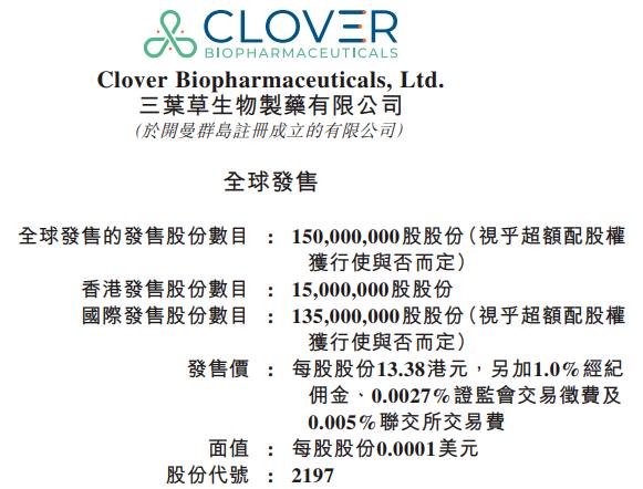 2021年11月4日,三叶草生物发行价确定为13.38港元,香港发行1500万股,国际发售1.35亿股。三叶草生物将于11月5日登陆港股,发行市值为155亿港元。