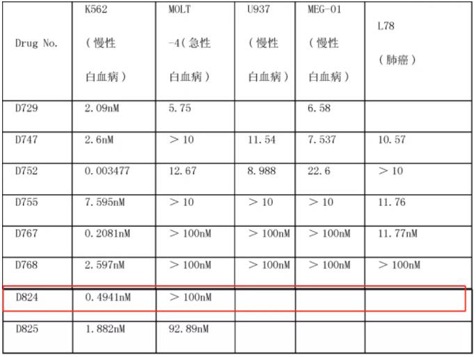 2010年,现暨南大学药学院院长丁克申请的化合物专利中,保护了一类杂环炔苯类化合物及其药用组合物;并公开了该杂环炔苯类化合物对各耐药细胞株的抑制活性,其中的D824(GZD824、HQP1351)正是现在的奥雷巴替尼,这应该是奥雷巴替尼首次披露结构;从图5可以看出该杂环炔苯类化合物对K562(慢性白血病)的抑制效果显著,其中奥雷巴替尼的IC50达到0.494 nM,对MOLT细胞的抑制在100nM以上;在肿瘤移植模型中能够显著抑制肿瘤的生长;在大鼠药代动力学和生物利用度的实验中证实了该类炔苯环化合物成药性非常好。