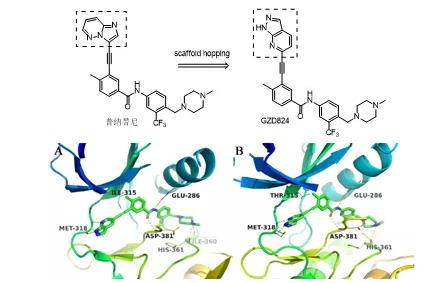 第三代BCR-ABL抑制剂中普纳替尼,则不需要与苏氨酸315残基形成氢键,且分子中的炔烃基可以容纳 T315I 侧链,避免了与 I315 侧链之间的空间位阻冲突。含3个氮的双环骨架占用BCR-ABL的T315I 激酶的腺嘌呤口袋,甲基苯基占据后面残基的疏水口袋,三氟甲基苯基紧密结合由DFG 外构象诱导的口袋,而其N-甲基哌嗪基团则与ABL 形成2 种广泛氢键。通过与BCR-ABL激酶的疏水位点结合,造成构型失活,而非结合于活化的ATP 位点,从而能够避免与野生型BCR-ABL 的T315I 的侧链结合,形成有利于结合T315I 异亮氨酸突变侧链的范德华力,并改变异亮氨酸突变体的空间位阻,达到抑制T315I 的作用。临床前的体内体外活性数据也体现了这一基于结构设计的合理性。