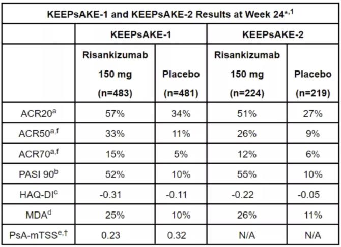 本次批准基于两项随机双盲、多中心、安慰剂对照的3期临床试验获得的积极数据。两项试验均达到其主要终点,在治疗第24周时,接受Skyrizi治疗的患者分别有57.3%和51.3%达到ACR20应答(表示疾病严重程度与基线相比降低至少20%),安慰剂组为33.5%和26.5%(p<0.001)。此外,试验也达到序列次要终点,患者的皮肤症状清除率(使用PASI 90测量)、身体功能(使用HAQ-DI指数检测)和最小疾病活动度(MDA)均得到显著改善,具体数据请见下图。