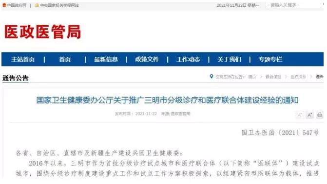 11月22日,国家卫健委医政医管局官网发布《关于推广三明市分级诊疗和医疗联合体建设经验的通知》(下称《通知》),总结了三明市推动改革政府管理体制、推进紧密型医联体建设、完善各项补偿机制、推动优质医疗资源下沉、加快基层医疗卫生机构人才培养、构建医防协同运行管理模式、注重发挥中医药作用等7条经验,并就下一步医联体融合发展、医保支付方式改革等工作明确提出了八项重点任务。