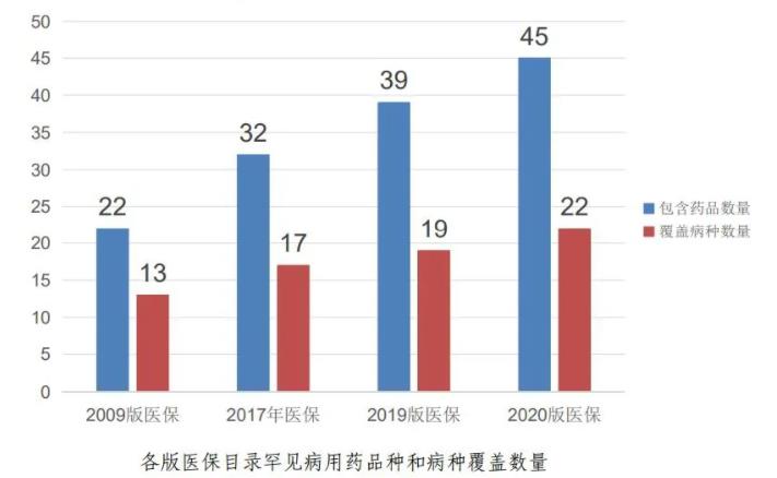 除癌症、心血管、风湿免疫等广为人知的疾病领域外,医保目录调整近年来也越来越关注特殊疾病人群的用药保障,罕见病用药就是其中的典型代表。近年的医保目录调整都将罕见病用药作为调整重点之一,纳入目录的药品数量增加、覆盖的罕见病病种扩大。《蓝皮书》发布的相关数据显示,目前最新的2020版医保目录罕见病用药品种达到45个,覆盖了22种罕见病病种数,与2009版医保药品目录相比纳入罕见病用药品种数增加了105%,覆盖的罕见病病种数增加了69%。