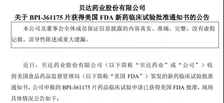 12月5日,贝达药业发布公告,称其BPI-361175片临床试验申请已获得美国 FDA批准,拟用于治疗携带EGFR C797S突变及其他EGFR相关突变的非小细 胞肺癌。