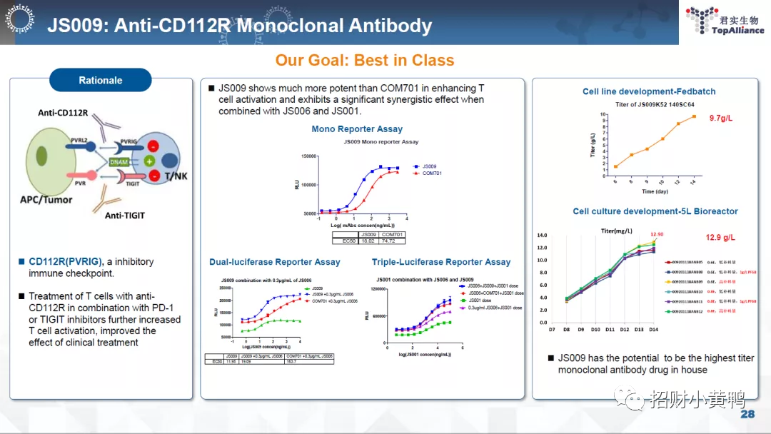 JS009 能以高亲和力特异性地结合 CD112R,有效阻断 CD112R 与其配体 CD112 信号通路,进而促进 T 细胞和 NK 细胞的活化和增殖,增强免疫系统杀伤肿瘤细胞的能力。同时 JS009 选择了 IgG4 亚型,可降低抗体依赖的细胞介导的细胞毒性作用(ADCC)和补体依赖的细胞毒性(CDC)。JS009 是国内首个获得药物临床试验申请受理的抗 CD112R 单克隆抗体注射液。