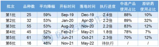 从前5批带量采购产品来看,中选产品平均价格降幅均超过50%,中选结果整体执行进度为协议的2倍(意味着中选产品医院实际采购量为协议量的2倍)。历次中选产品整体使用占比在70~90%之间,原研产品的使用占比整体在10~20%之间(含中选原研产品)。
