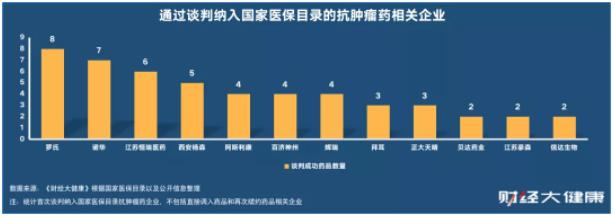 国内外药企都迫切的想要抓住医保目录大幅调整窗口期。抗肿瘤药界素有“流水的巨头,铁打的罗氏”一说,其谈判成功八个抗肿瘤药进入医保,成为数量最多的企业。