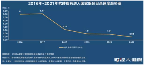 “历史欠账”基本在两年内得以解决。2019年,国家医保目录正式进入每年一次动态调整,自此新增抗肿瘤药几乎都是2017年之后获批上市的新药。抗肿瘤药从上市到进医保的速度,从2016年的平均八年,提速到平均0.94年,成为帮助创新药快速打开市场的最大助力者之一。