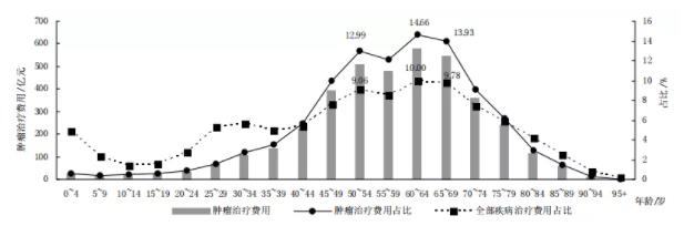 他们是癌症治疗费用最大的支出者。在上述李涛的文中测算,根据5岁年龄分组,60岁—64岁人群的肿瘤治疗费用占比最高(14.66%)。中国的肿瘤治疗费用集中在45岁—74岁人群(72.79%),高出同期中国疾病总治疗费用中的该年龄段人群占比近20个百分点。