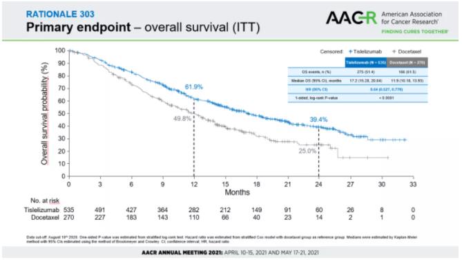该试验由同济大学附属上海市肺科医院周彩存教授担任 Leading PI,共在 10 个国家入组了 805 例患者,以 2:1 的比例随机至百泽安®试验臂或多西他赛试验臂。4 月 13 日,在 2021 年 AACR 上,百济神州以口头报告的形式发布了 RATIONALE 303 研究的中期分析数据。
