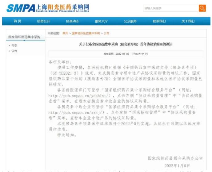 1月6日,国家组织药品联合采购办公室(简称“联采办”)通过上海阳光医药采购网发布《关于公布全国药品集中采购(胰岛素专项)首年协议采购量的通知》。根据通知,本次胰岛素专项集采中选结果将于2022年5月实施,具体执行日期以各地发布通知为准。