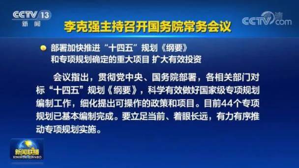 会议指出,贯彻党中央、国务院部署,各相关部门对标“十四五”规划《纲要》,科学有效做好国家级专项规划编制工作,细化提出可操作的政策和项目。目前44个专项规划已基本编制完成。要立足当前、着眼长远,有力有序推动专项规划实施。