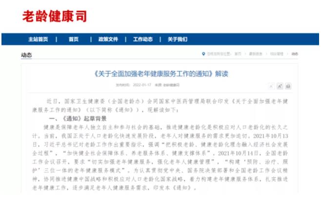 近日,国家卫生健康委、全国老龄办、国家中医药局联合发布《关于全面加强老年健康服务工作的通知》(以下文内简称《通知》),其中指出,我国正处于人口老龄化快速发展阶段,老年人对健康服务的需求更加迫切。