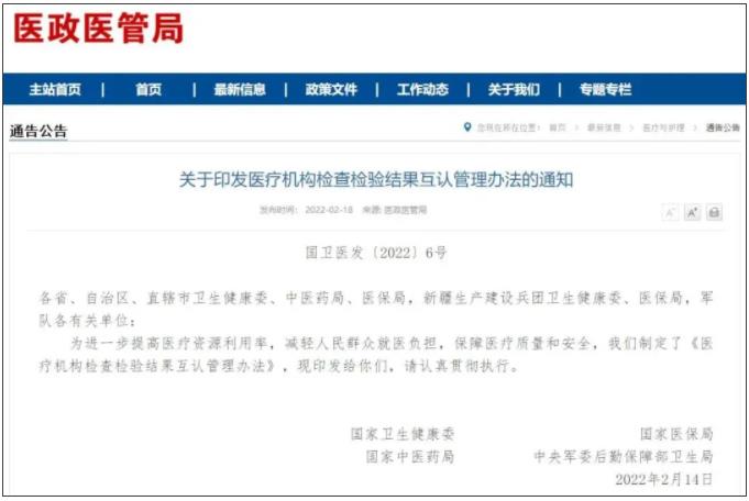 近日,国家卫生健康委、国家医保局、国家中医药局、中央军委后勤保障部卫生局印发通知,为进一步提高医疗资源利用率,减轻人民群众就医负担,保障医疗质量和安全,制定了《医疗机构检查检验结果互认管理办法》(以下简称《管理办法》),该办法自2022年3月1日起施行。