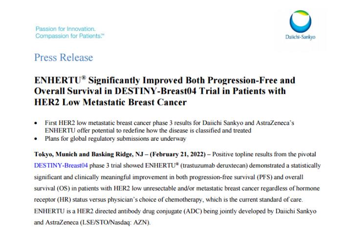 2月21日,阿斯利康/第一三共宣布关键III期DESTINY-Breast04临床试验获得高水平积极结果。在HER2低表达不可切除和/或转移性乳腺癌患者中,与化疗相比,Enhertu(trastuzumab deruxtecan)在无进展生存期(PFS)和总生存期(OS)方面均有统计学意义和临床意义的改善,无论患者激素受体(HR)状态如何。该项结果是首个针对HER2低表达转移性乳腺癌患者的HER2靶向治疗的III期试验结果。