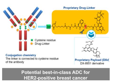 Enhertu是一款靶向HER2的ADC,采用第一三共专有的DXd ADC技术设计。由HER2单抗通过稳定的四肽可裂解连接子连接于拓扑异构酶I抑制剂有效载荷(依沙替康衍生物)上。该产品是第一三共肿瘤产品组合中领先ADC,也是阿斯利康ADC科学平台中最先进的项目。2021年,Enhertu全球销售额是4.26亿美元(不包括日本市场)。