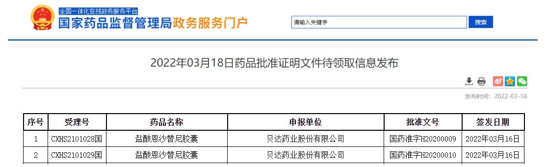 3 月 18 日,NMPA 官网最新批件显示,贝达药业的 ALK 抑制剂恩沙替尼胶囊新适应症上市申请获批,一线治疗 ALK 阳性 NSCLC。点此回顾受理号审评历程