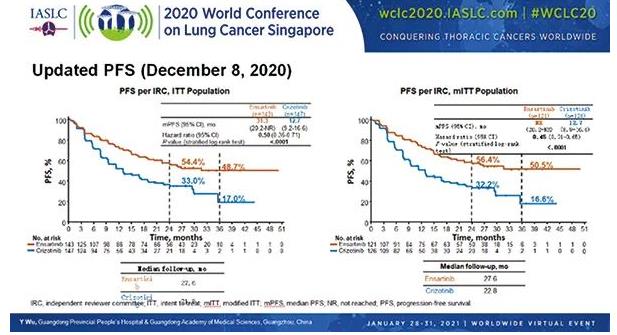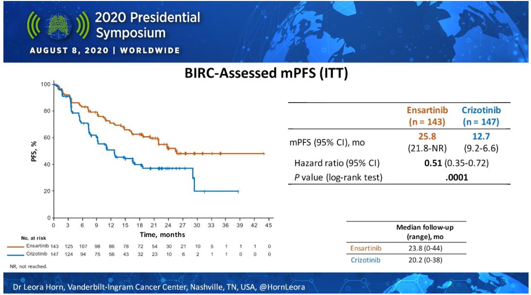 在 2020 年 8 月的 WCLC Presidential Symposium 上,恩沙替尼用于一线治疗 ALK 阳性 NSCLC 患者的全球多中心 III 期临床(eXalt3)结果首次公布。