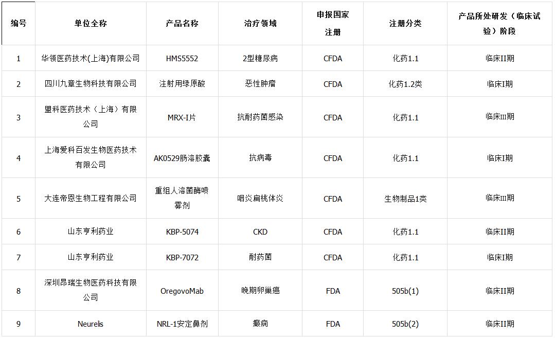 本次大会自召开新闻发布会以来,受到国内外医药行业及投资行业等各界广泛关注。其中,临床数据全球首发专场关注度居高不下,截止目前,已经收到国内外医药创新企业临床数据首发项目申请10余个,涉及肿瘤、糖尿病、抗病毒、抗耐药菌、癫痫等多个治疗领域的1类新药。为此,大会组委会专家成员经过认真探讨、评估,决定华领医药技术(上海)有限公司HMS5552项目(化药1.1,临床II期,治疗领域:2型糖尿病)、四川九章生物科技有限公司注射用绿原酸(化药1类,治疗领域:恶性肿瘤)等9个项目(具体详见下表)在本次大会创新药物临床数据全球首发专场进行数据全球发布。