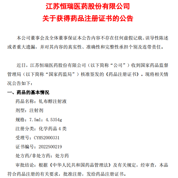 3月27日,恒瑞医药发布公告,公司按4类申报的钆布醇注射液上市申请已获NMPA批准。