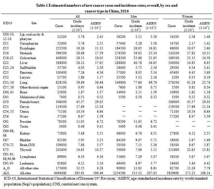 2016年我国癌症发病情况