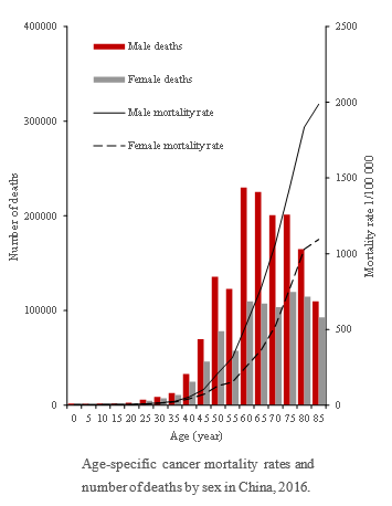 2020年中国新发癌症病例457万例,其中男性248万例,女性209万例,2020年中国癌症死亡病例300万例,其中男性182万例,女性118万例。