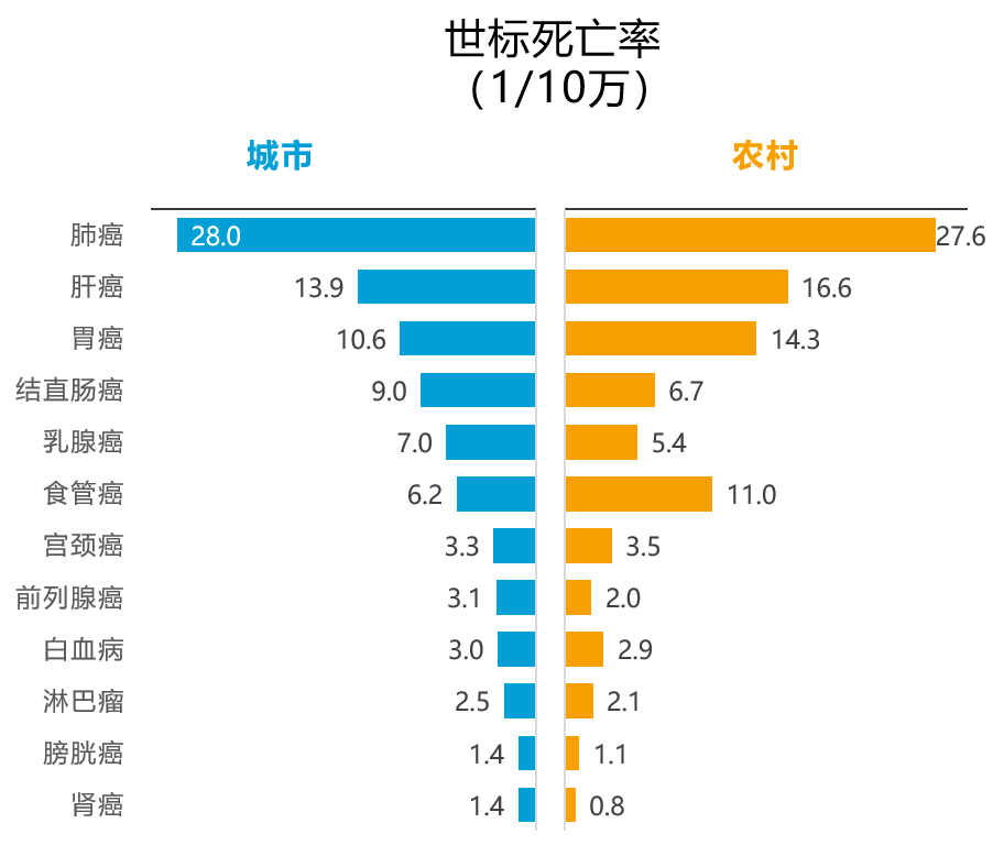 城市高于农村: 肺癌、结直肠癌、乳腺癌、前列腺癌