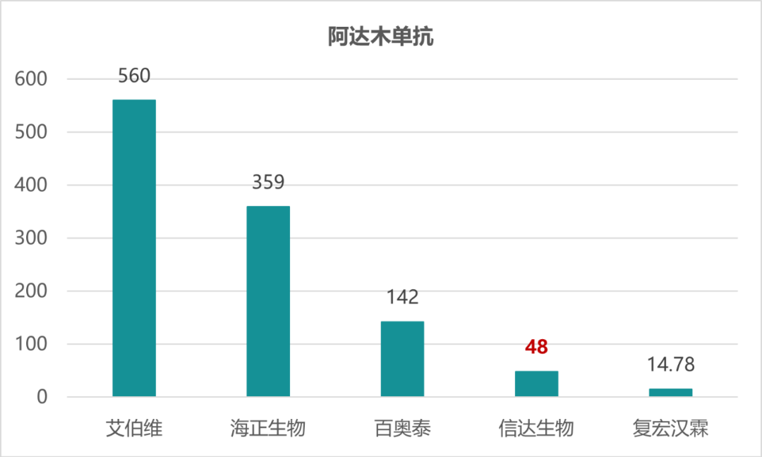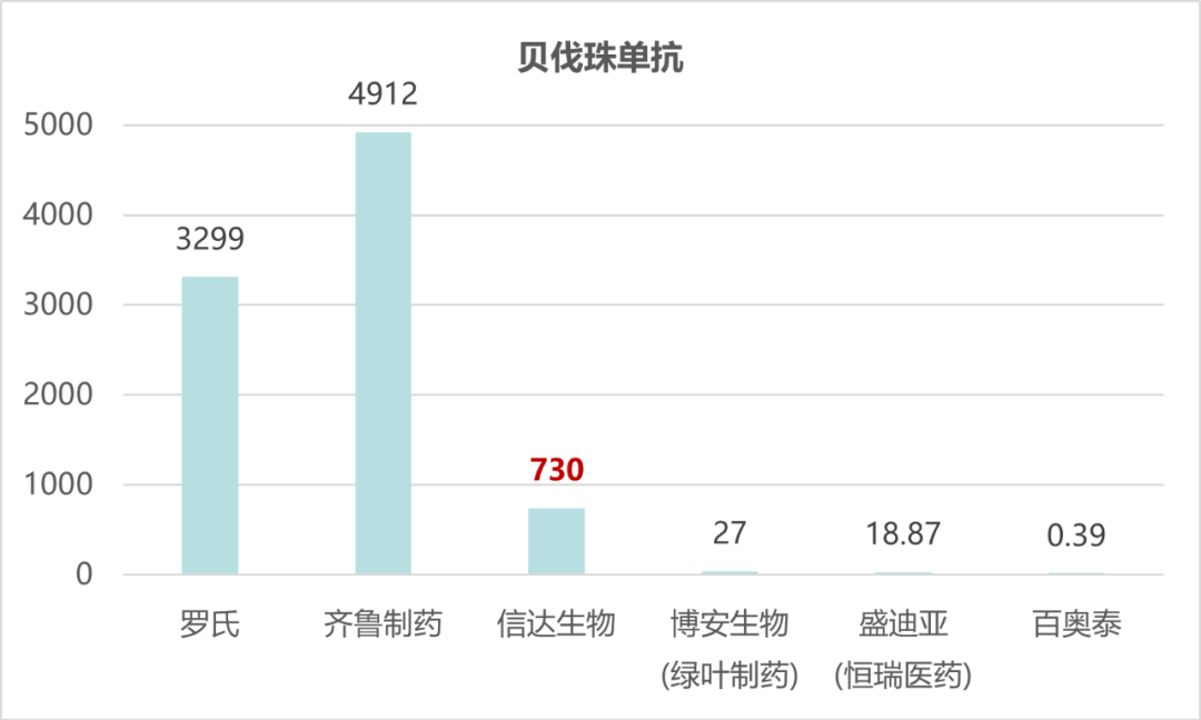 图表4. 2021年中国市场贝伐珠单抗、阿达木单抗销售额(单位:百万元)