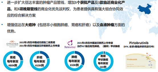 此外,信迪利单抗在2021年下半年提交了三项新适应症上市申请,分别关于一线食管癌、一线胃癌、EGFR+ nsqNSCLC,有望在2022年获得批准。这一方面能够在医保之外提升部分销售额,另一方面为2022年医保谈判提供新的砝码。除了自主研发,信达生物同步紧抓引进合作。2022年3月28日,信达生物与礼来宣布深化战略合作,获得已获批的抗VEGFR-2单抗雷莫西尤单抗(希冉择/CYRAMZA)、即将获批的RET抑制剂赛普替尼(Retsevmo)在中国大陆的独家商业化权利,以及全球临床III期BTK抑制剂pirtobrutinib的商业化优先谈判权。雷莫西尤单抗是2020年全球销售额超过10亿美元的重磅药物,另外两个药物是礼来以80亿美元收购的Loxo Oncology公司的核心资产。此项合作体现了礼来的诚意和对信达生物的信任。