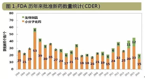2016年,FDA下属CDER共批准了22个新分子实体,包括:15个NDA、7个BLA。这个数字为2008年来新低,数字背后是小分子新药锐减,生物制品则热度不减。CBER则批准了4个新药(新分子实体),包括2个凝血因子Ⅷ药物Kovaltry和Afstyla、凝血因子Ⅸ药物Idelvion和口服霍乱疫苗Vaxchora。